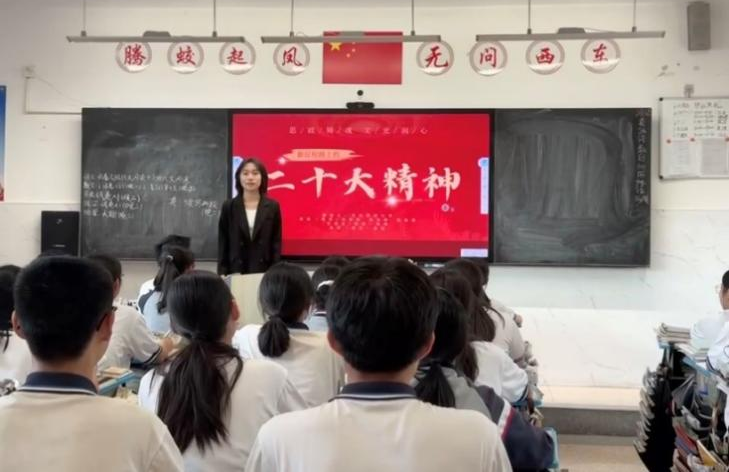 团队借助历史案例和诗文,深入解读马克思主义基本原理、党的二十大精神以及党的二十届三中全会精神等内容,并以此引导学生树立坚定的理想信念。宣讲过程中,主讲人紧扣“中国式现代化”这一宏大主题,通过“高铁八纵八横”等生动的案例图片,将国家战略蓝图具象化为可感可知的现实图景,有效激发了学生的爱国情怀和使命担当。在互动环节,诗词接龙与情景剧等活动让家国情怀在朗朗回声中愈发炽热,使青春脉搏与新时代同频共振。最后,团队围绕“大中小学思政一体化”主题与在校师生开展了深入访谈。