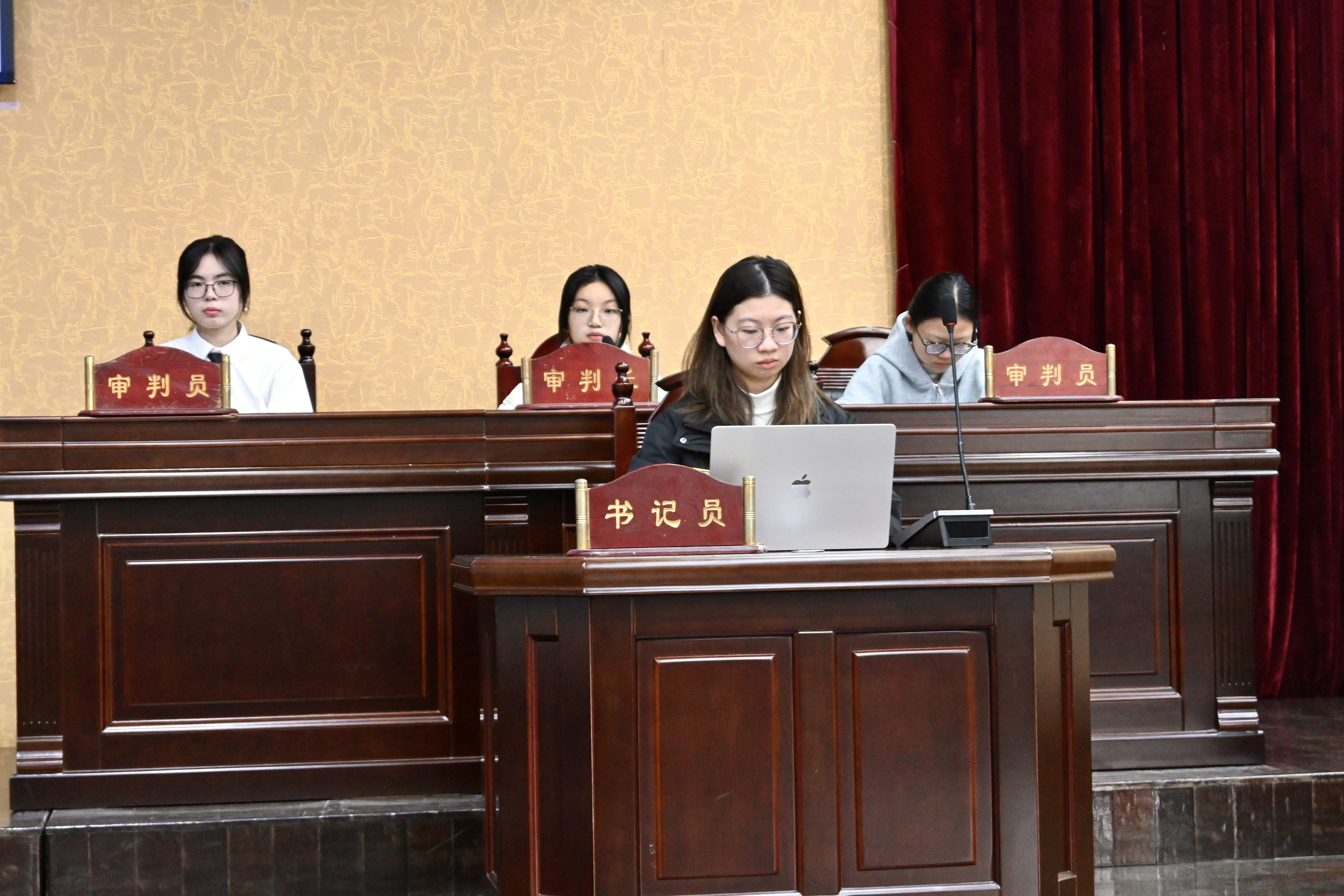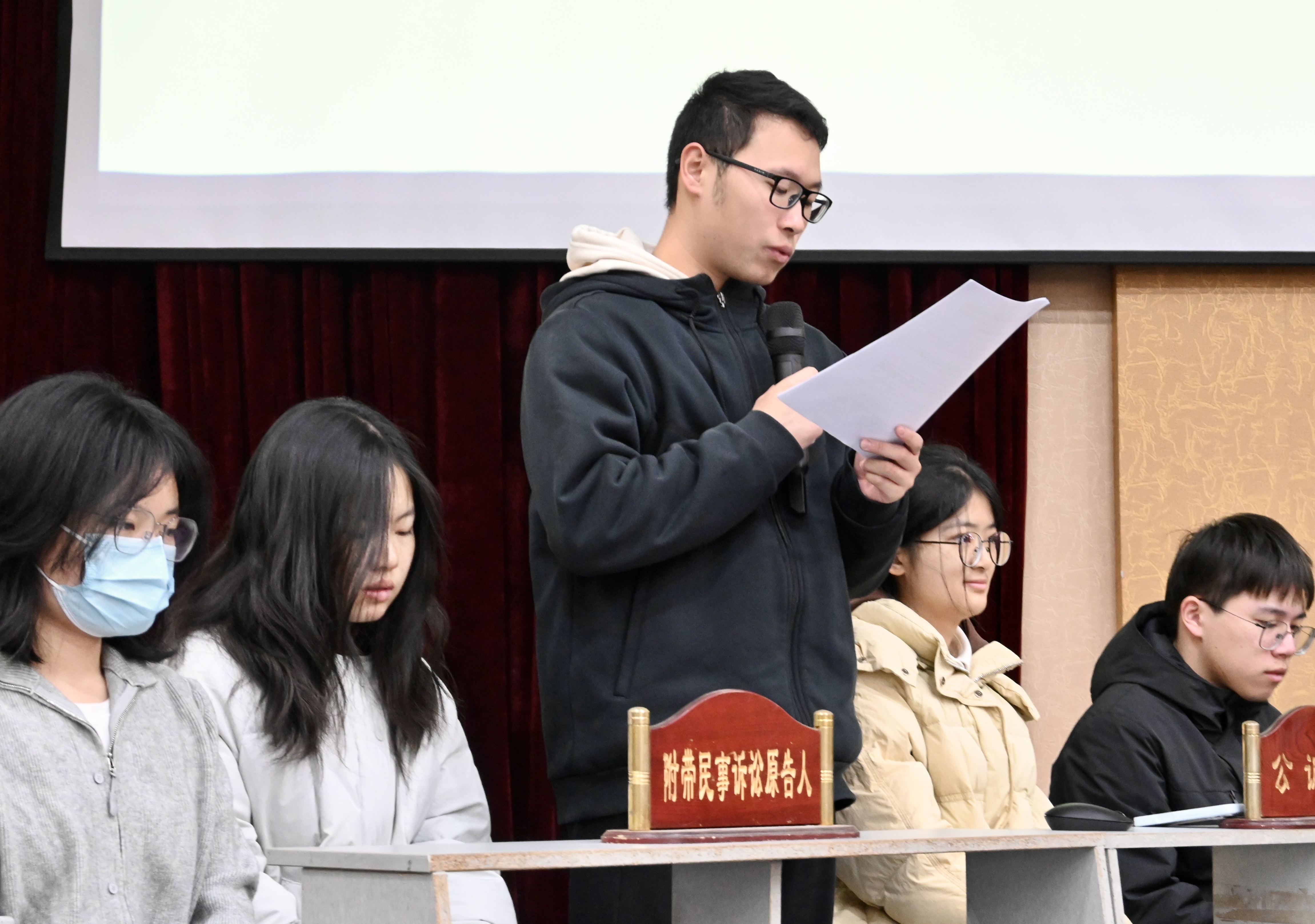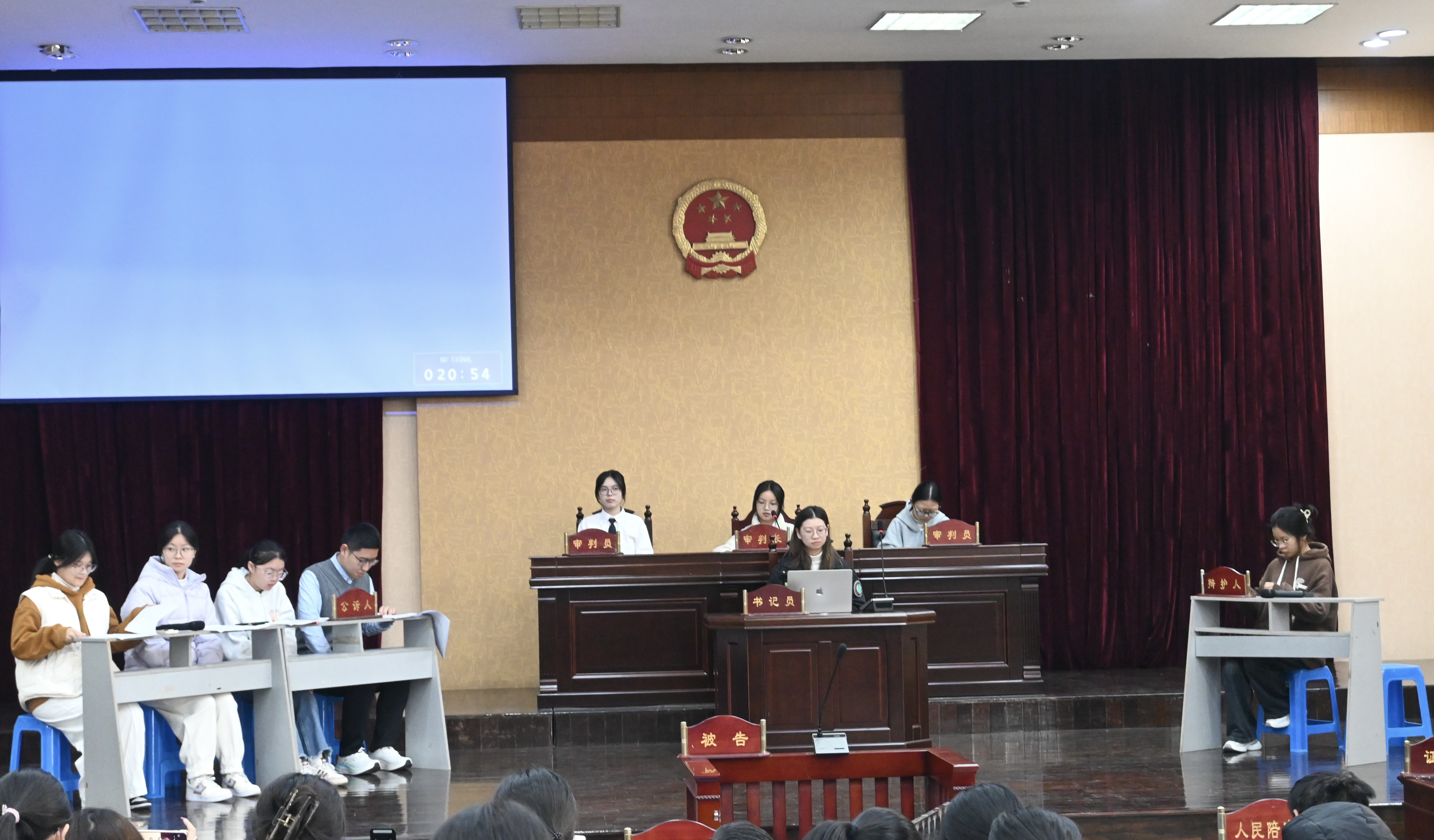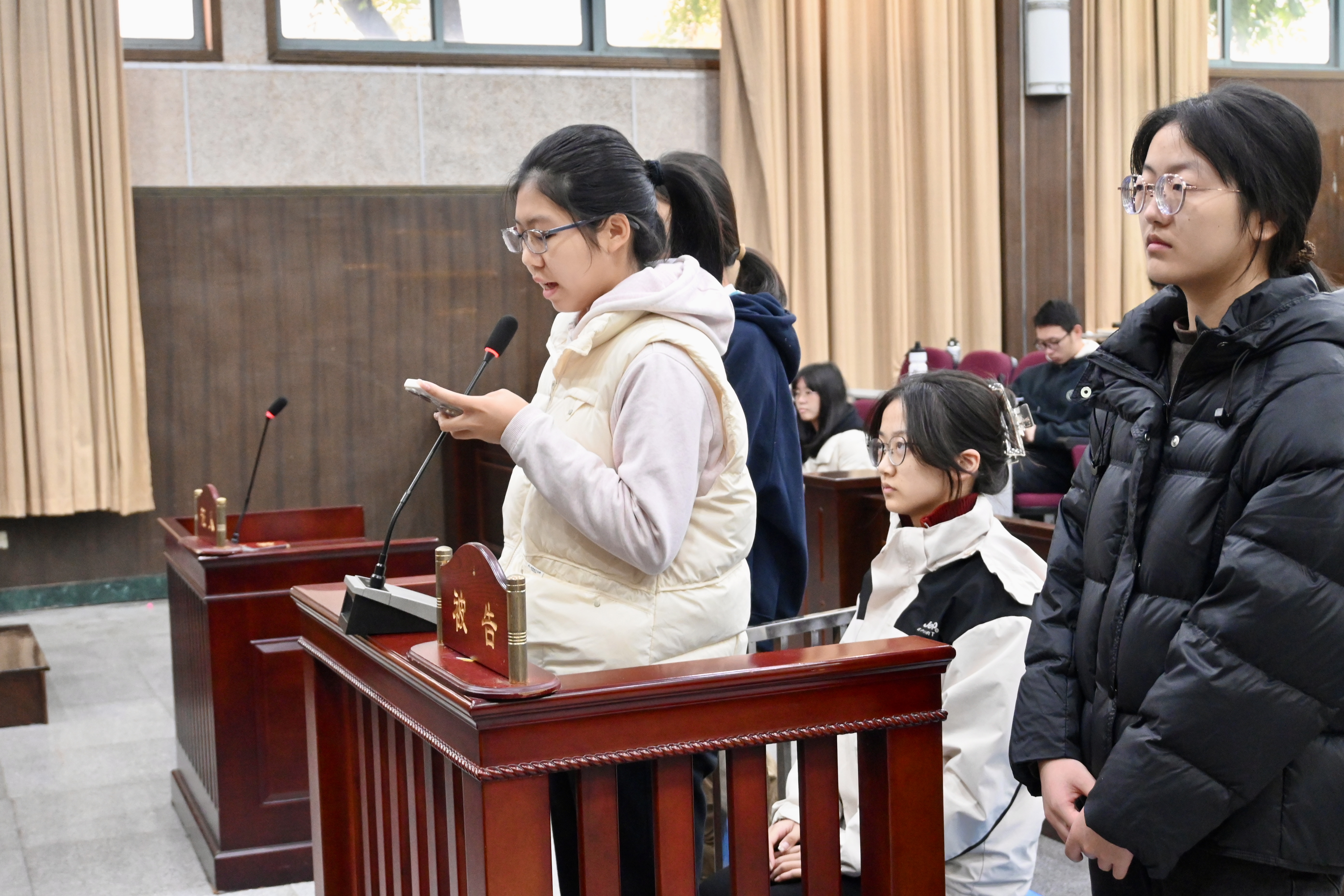 第二组同学带来“江某某正当防卫案”的模拟庭审。他们严格遵循刑事审理程序,围绕“被告人行为究竟是属于正当防卫还是防卫过当”这一问题进行激烈辩论。公诉人凭借法医鉴定报告、现场证人证言等证据,指出防卫行为明显超过必要限度,主张被告人构成故意伤害罪。辩护人则以校园霸凌的长期性、紧迫性为切入点,结合未成年人保护法和相关司法精神,强调被告人反击行为具有正当性。经法庭调查与辩论,审判长最终裁定江某某属正当防卫,当庭宣判无罪。